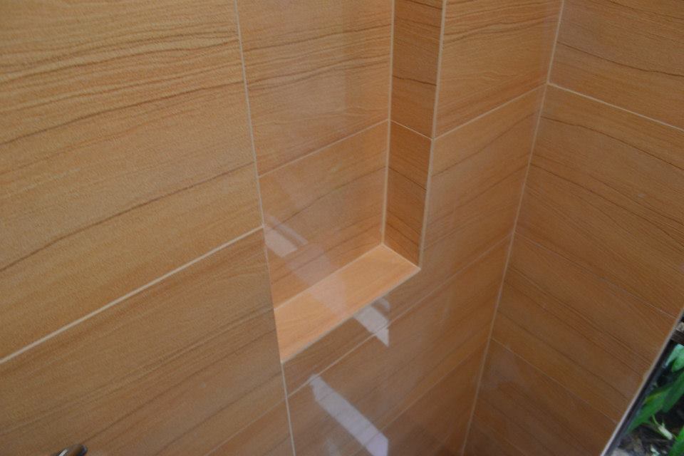 Layout – The 1940’s Timber frame home was made out of asbestos that needed to be professionally removed before we began. Never remove fibrous material without making sure. Being a timber frame home you have to cruel under the house which can be uncomfortable but necessary. When re-sheeting the walls with cement fiber sheet we built a shower box which works as a feature and a shelf. You can only really create these features with new homes or rooms where you are building a new wall. We set up a wall to wall open shower with a strip drain . The Jarrah vanity was moved to outside the room to create space. We install three individual heated towel rails that needed to be hardwired separately but created a really intense look