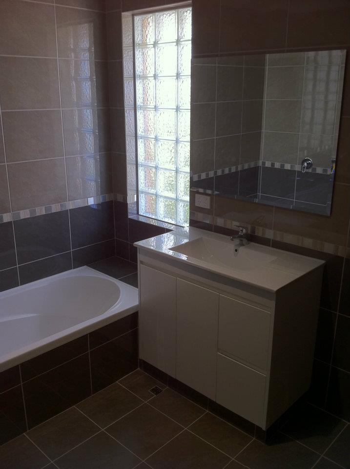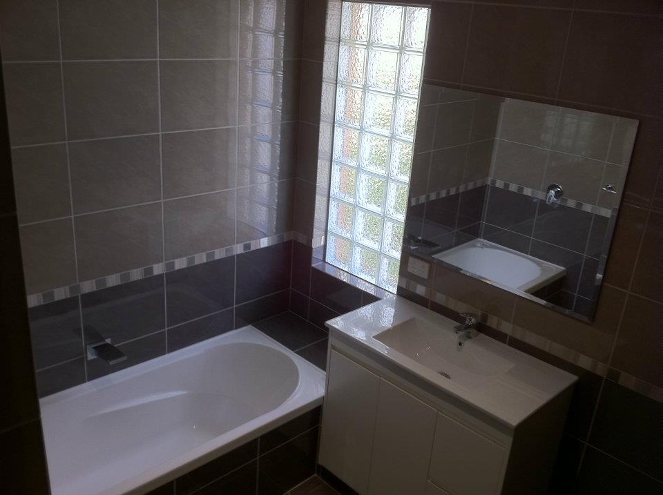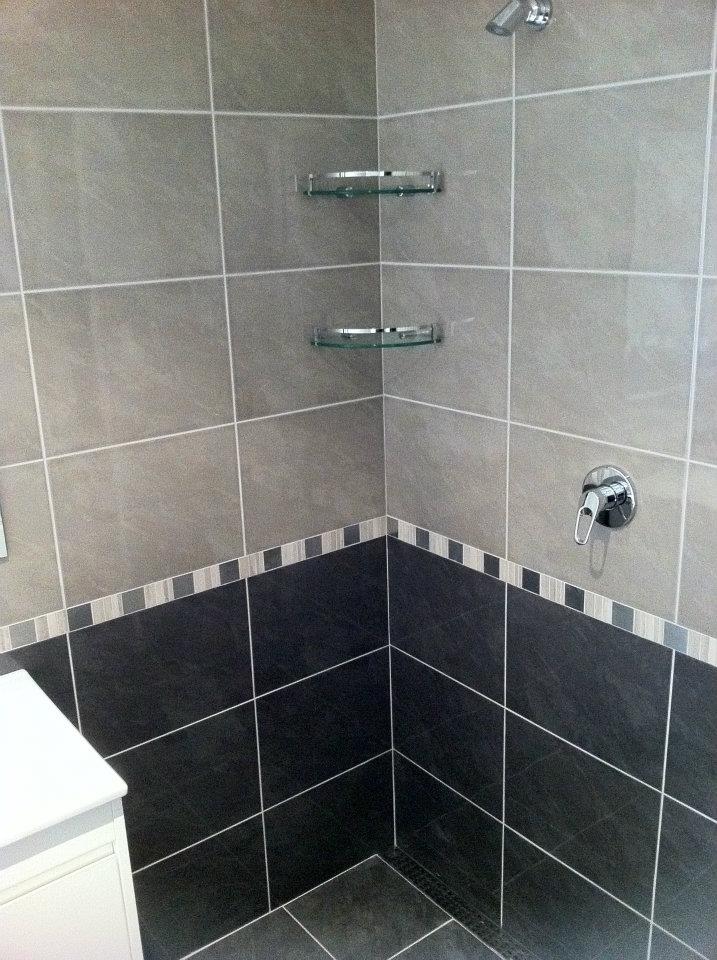 The Layout – This 1980’s Brookdale home has the classic single bathroom layout. It’s the Bath, Vanity, Shower all tight up against each other with no room to swing a cat. The clients didn’t want to move the layout they were trying to keep cost to a minimal but wanted to update and modernise the bathroom. So we took the main focal points such as the window and updated it with Glass Block Windows which has created this WOW effect. The real star of the room however is the Stratos Range, with the Velocity Steel Feature Boarder running through the centre. We start the base with the darker tile (Nero) half way up we divide the two with the Velocity Steel, which contains the (Bianco) throughout it. Second layer (Grigio) is then tiled to the ceiling creating the two toned effect that when you see in person blows you away. Sometimes you get lucky and sometimes such as this bathroom great planning with a eye for design brings it all together.