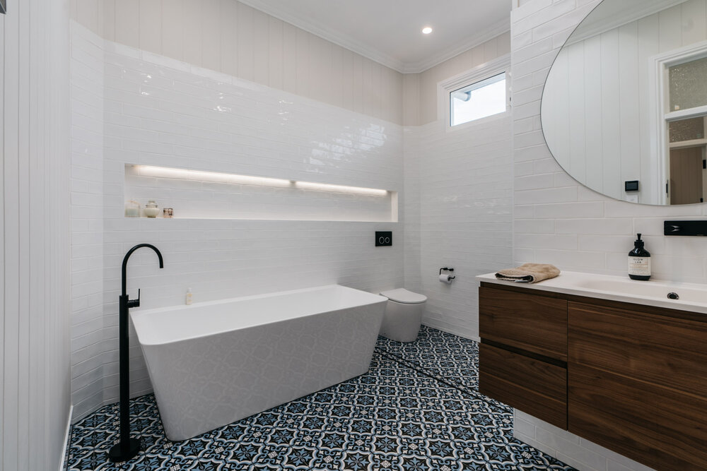 Undoubtably what I love about the below bath niche that is lit up is that the lighting shows off the long length of the niche.