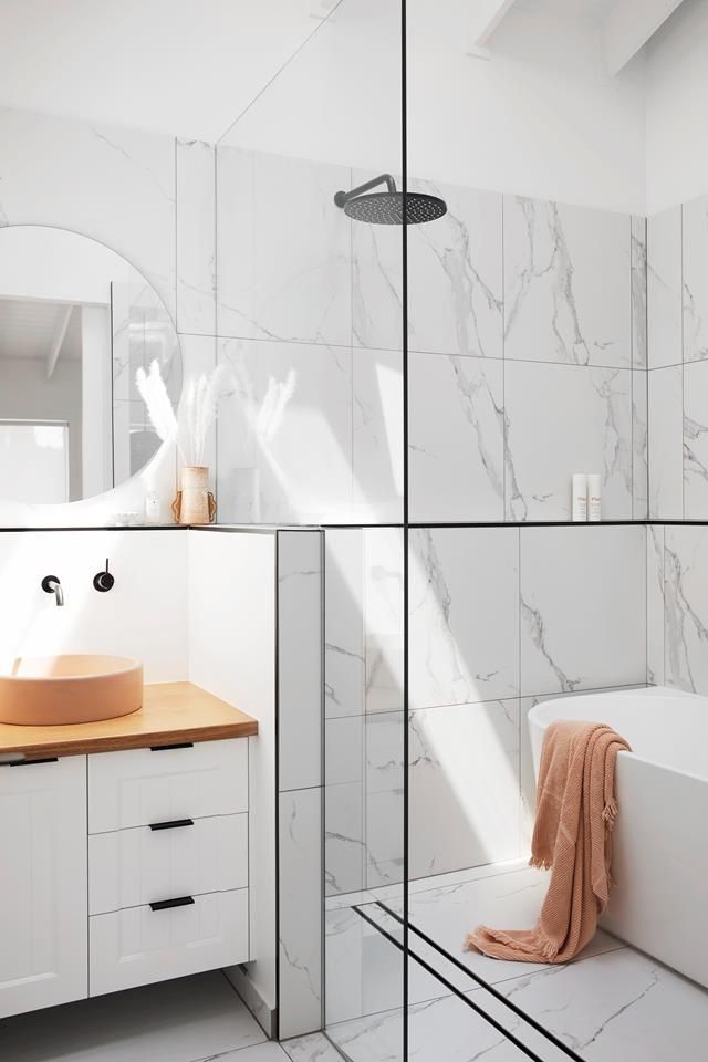 • Consider installing wall-hung fixtures (basin /toilet) to add to the spacious feel and free up the floor. Not only will  this look more visually appealing but will make cleaning even easier