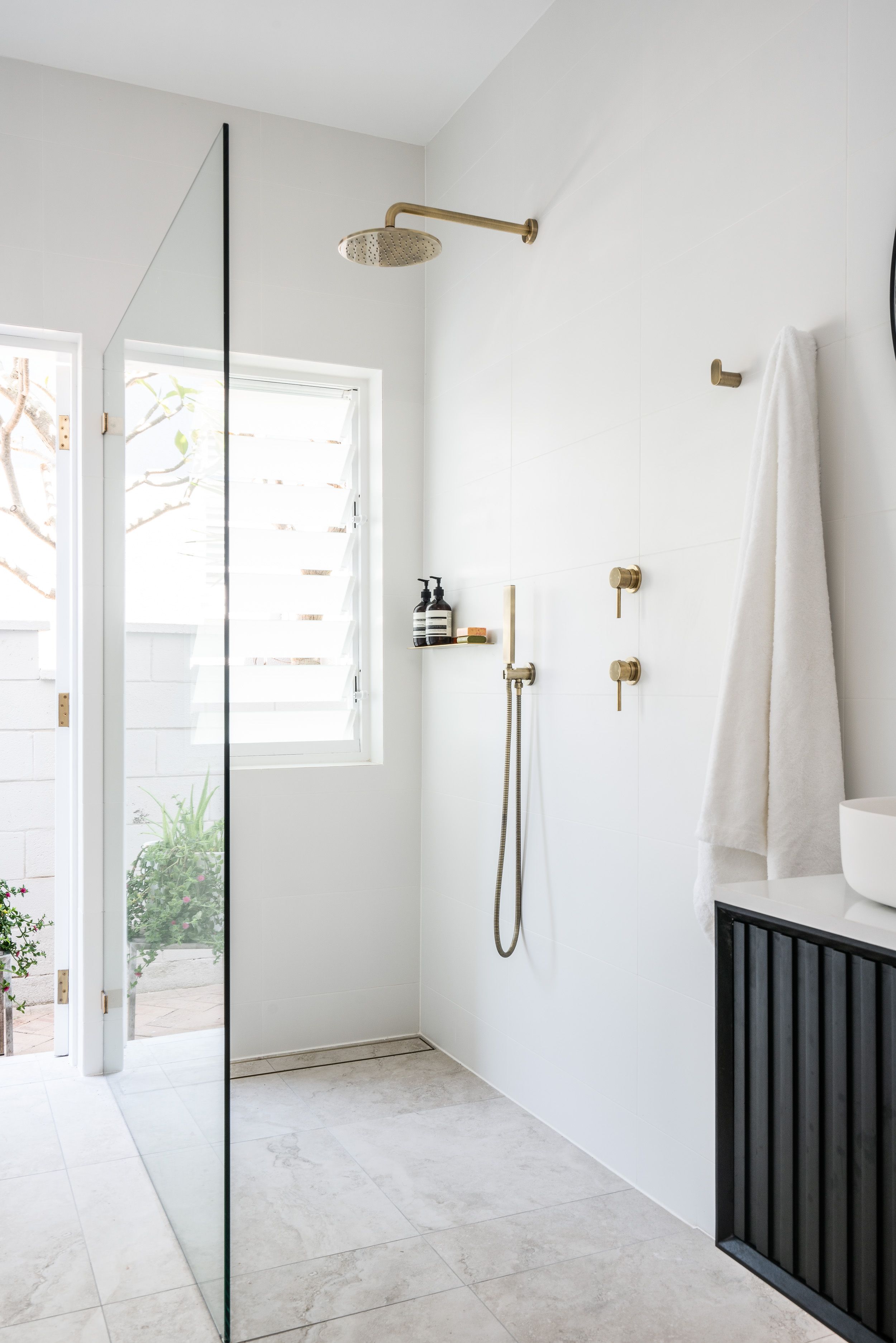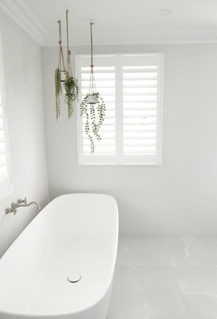 White plantation shutters are a fave for many bathrooms but not in the shower and we love putting them in our bathrooms for a super-chillax Sunday sessions vibe. Theyβre easy to adjust for light and privacy and the Luxaflex Polysatin ones are mould resistant so perfect for steamy rooms with lots of moisture