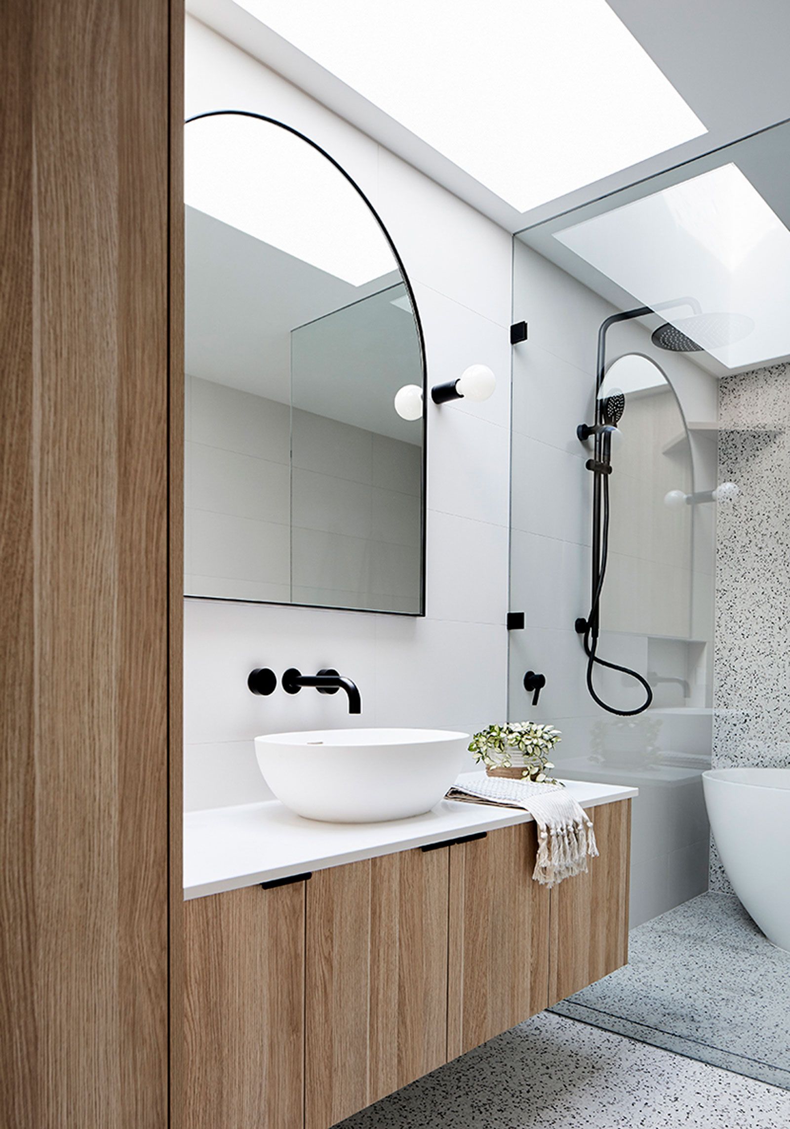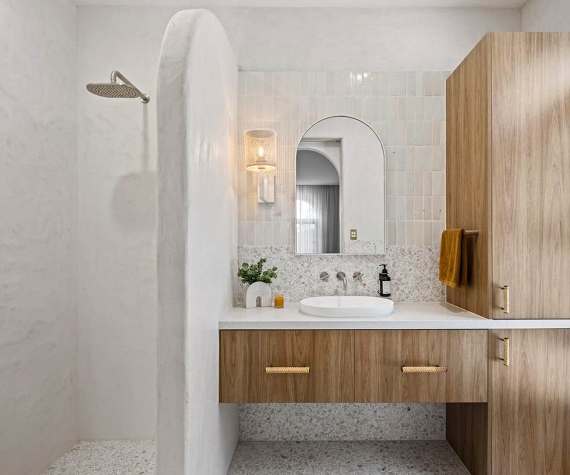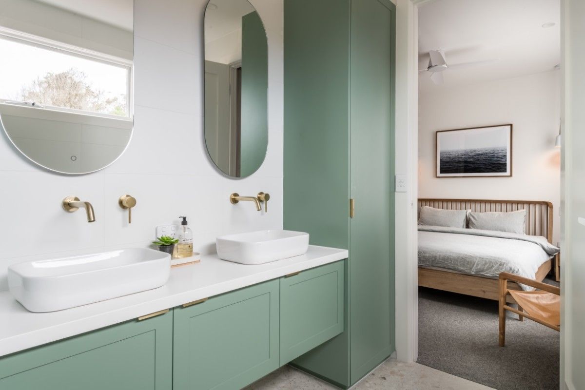 The benefit of the bench mount tall cupboard is it is more subtle and deeper than a mirror cabinet allowing for hand towels, bottles or towels if needed.
