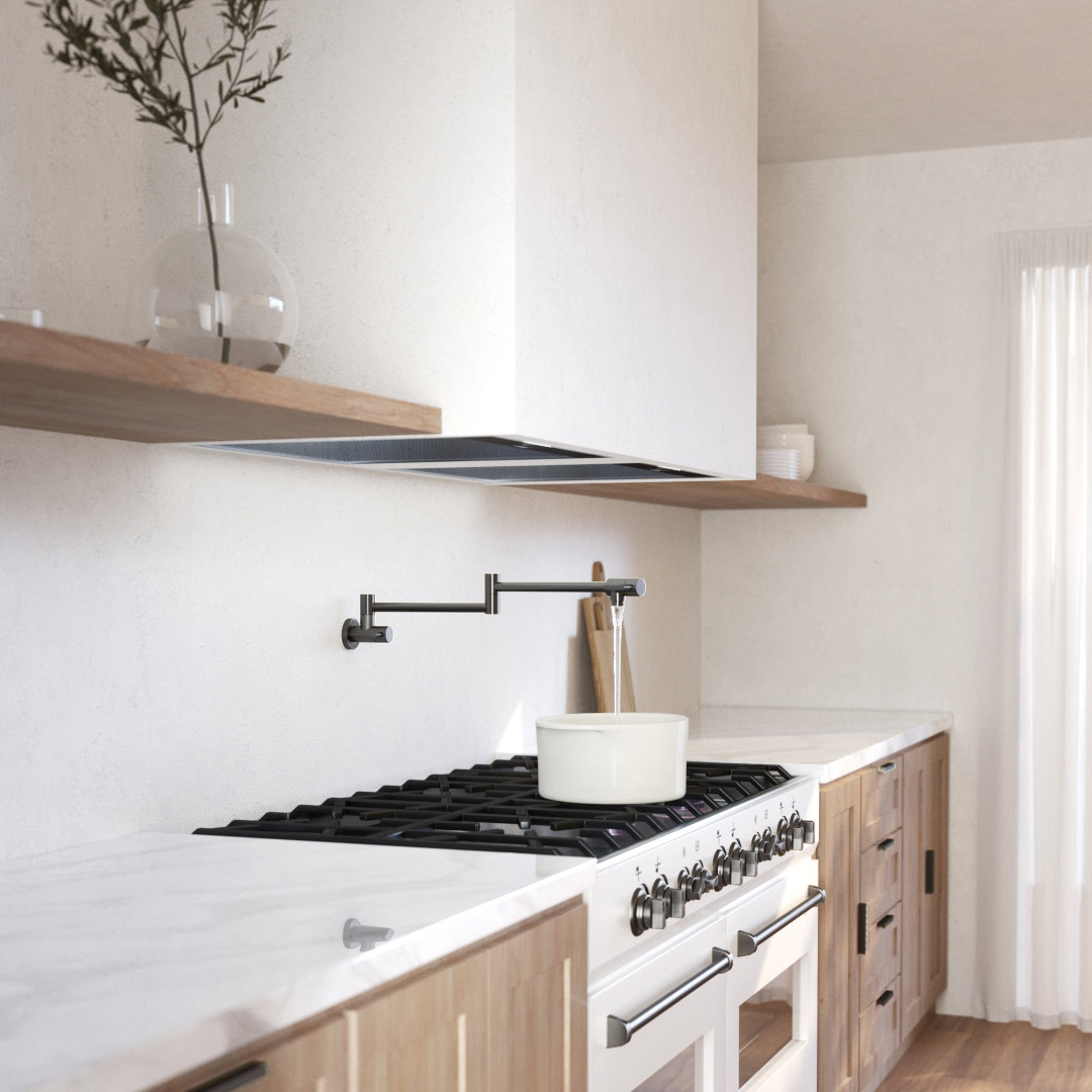 Pot faucets help you minimize the mess in your kitchen. They’ll also help you open up the space by taking away sink clutter. Since these faucets allow you to fill pots and pans right at the stove, this allows your sink to remain open for food prep and cleaning.