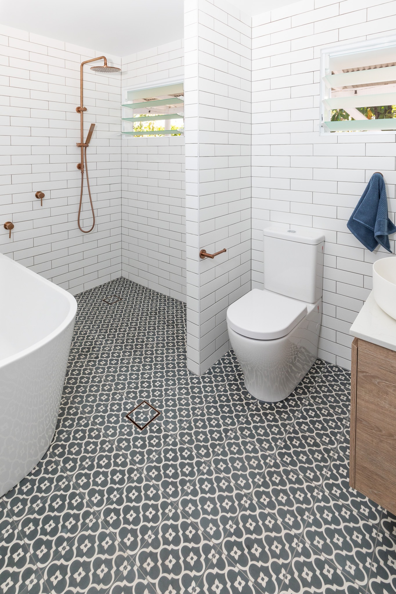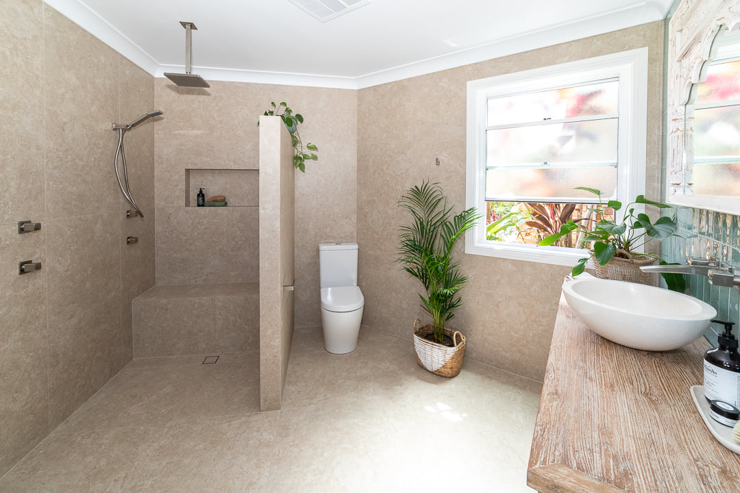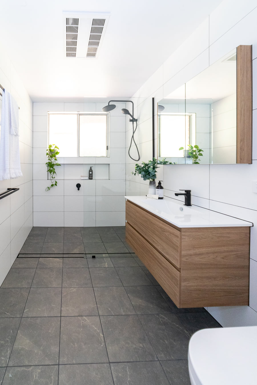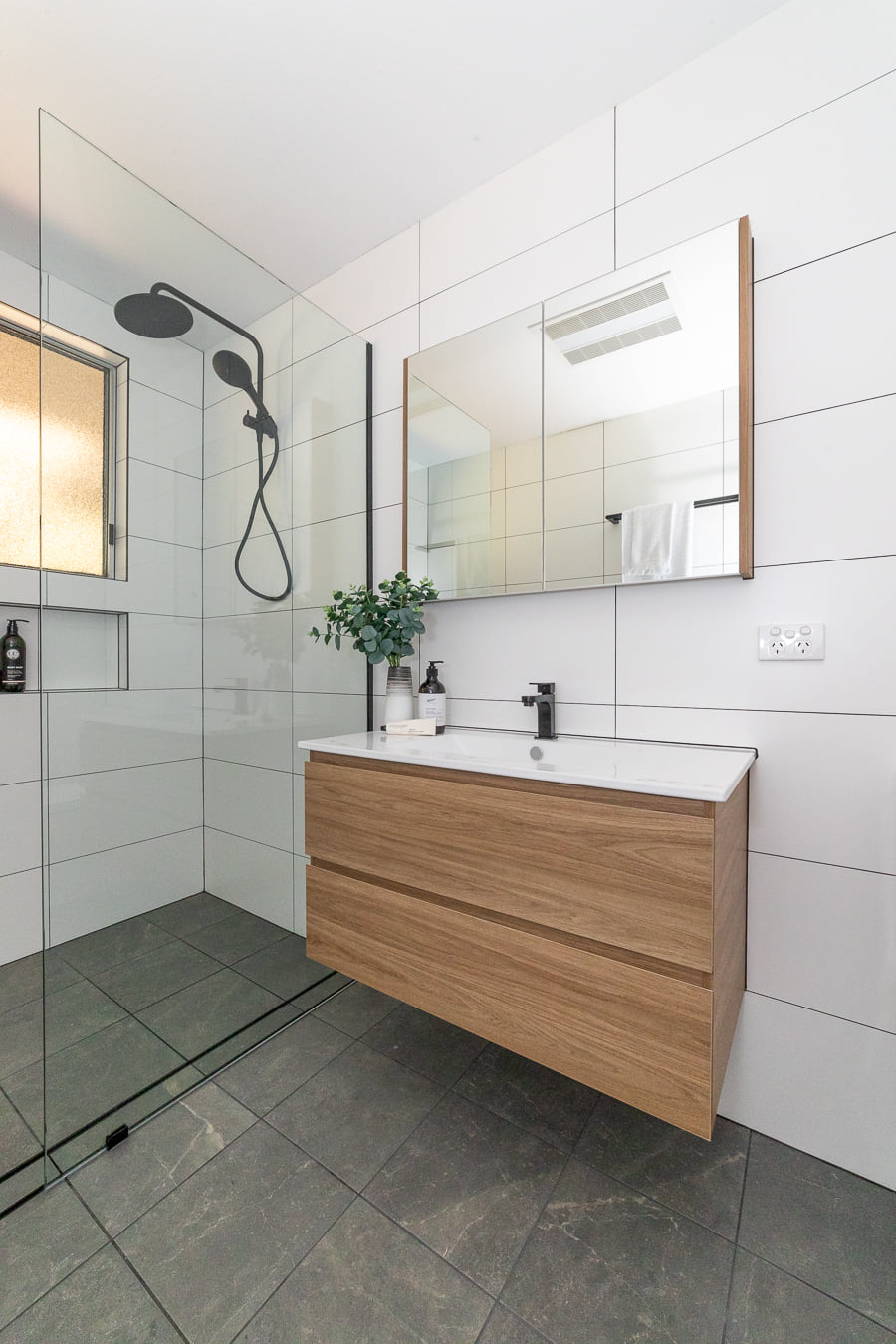 No glass was the only request for this Bicton bathroom renovation and we created a tile wall finished.