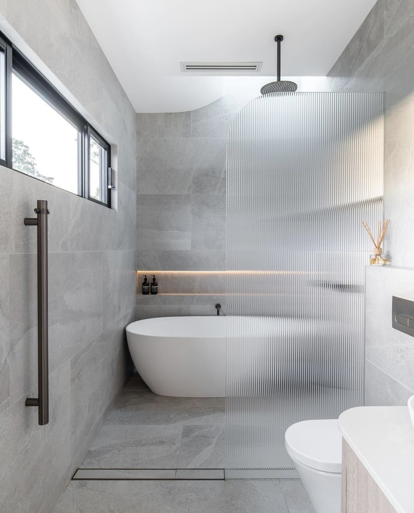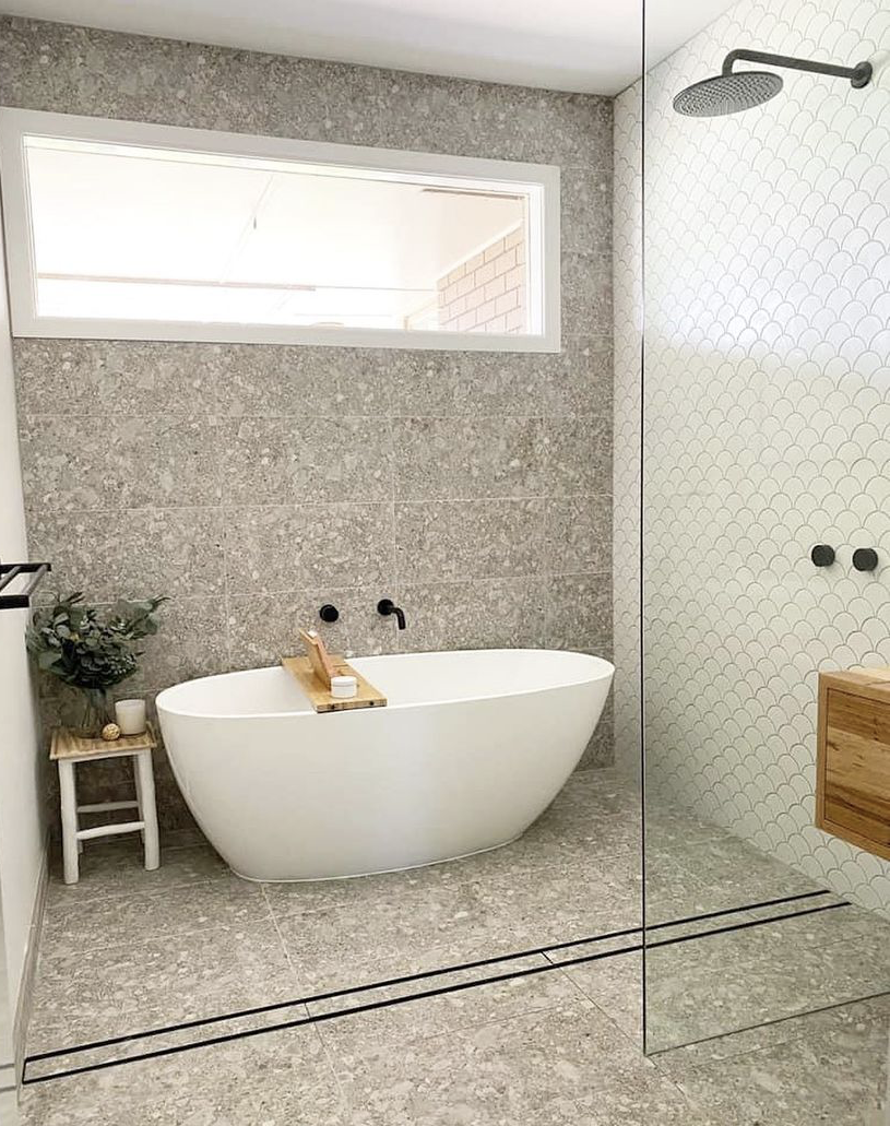 What I love about this wet room renovation is how much this wet room layout has opened up this bathroom. The big fish scale feature wall is perfect being dedicated to one wall and the decisions to run the floor tiles up the window wall have really made the bath pop without having to do anything drastic incredible job.