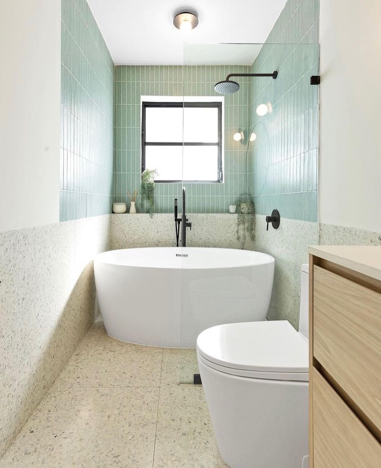 These types of wet rooms are what I call the 4 Part bathroom renovation which is all 4 big parts of a bathroom such as a shower, stand-alone bath, toilet and vanity. This space is doing so much with so little and I love that pop of colour as a feature wall that really makes this bathroom work so well.