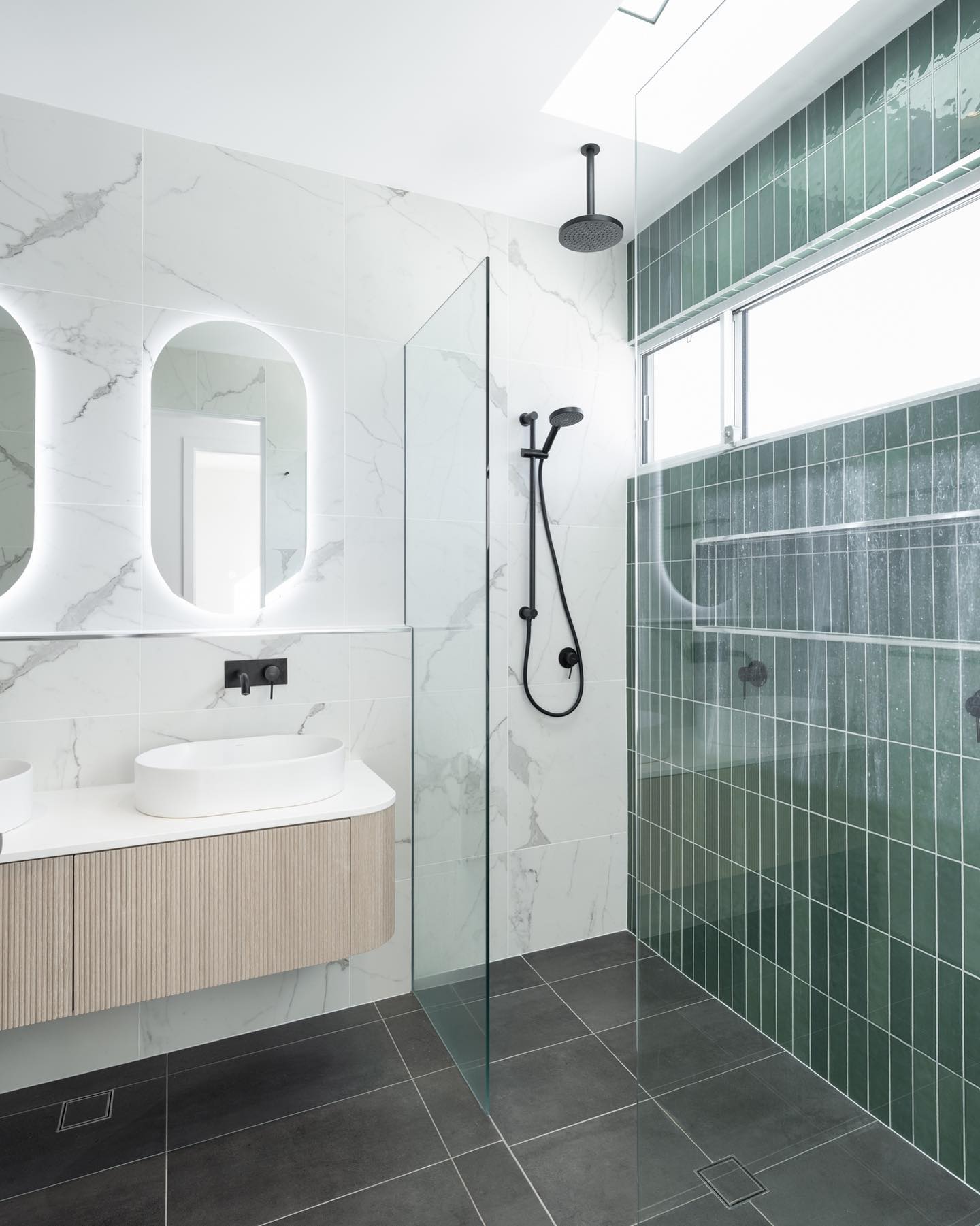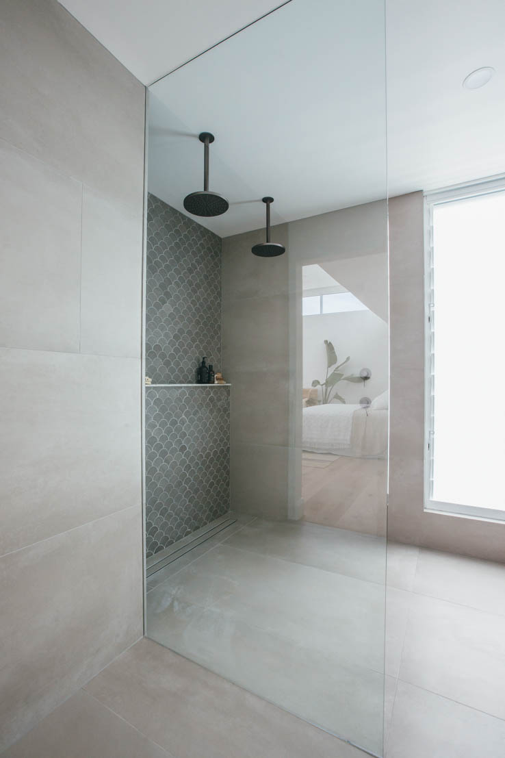 The second style that goes well is the all-grey bathroom. All grey bathrooms that use a matt finish tile make the dark metal tapware pop and the tones are perfect.