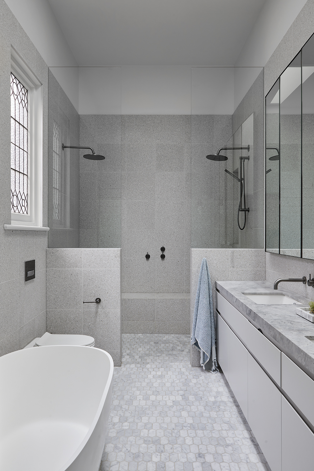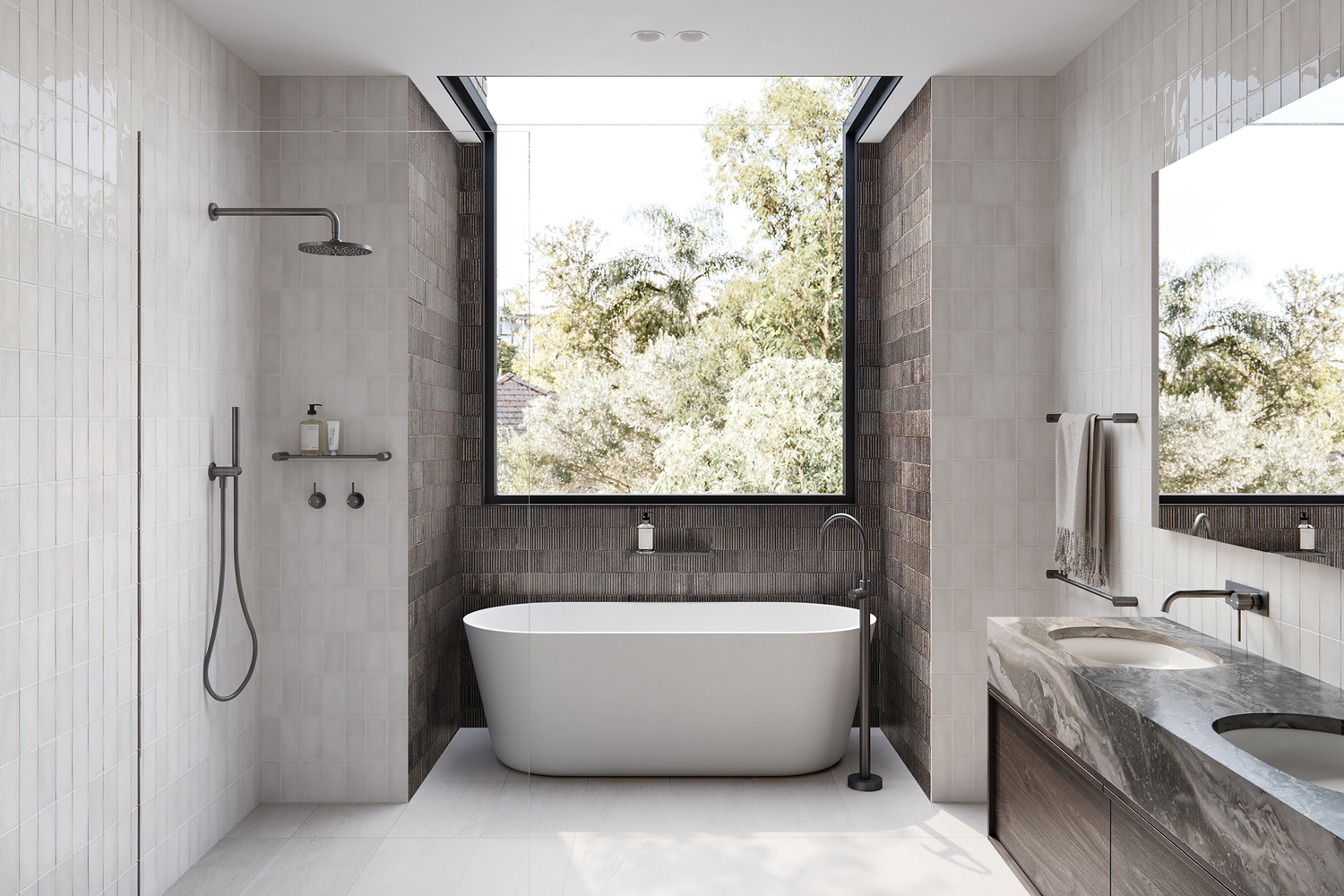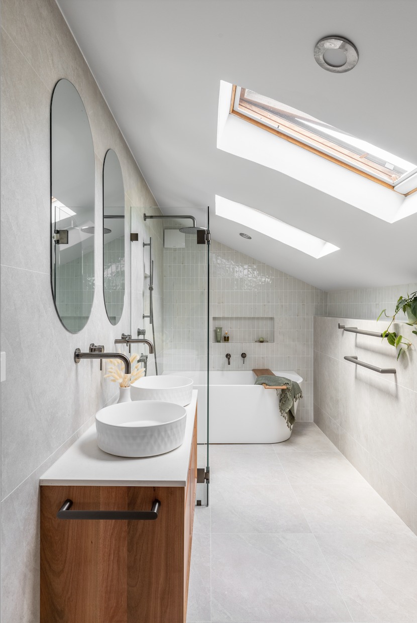 Gun-metal bathrooms are almost always cold bathrooms. The tone will be greys and whites but can have a touch of colour in a bold feature.