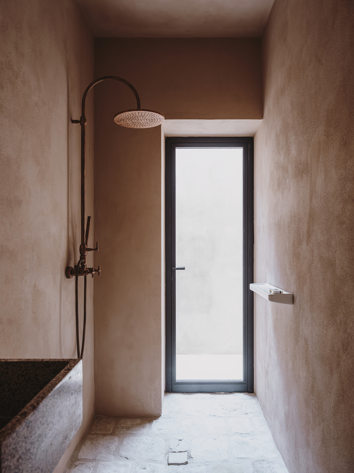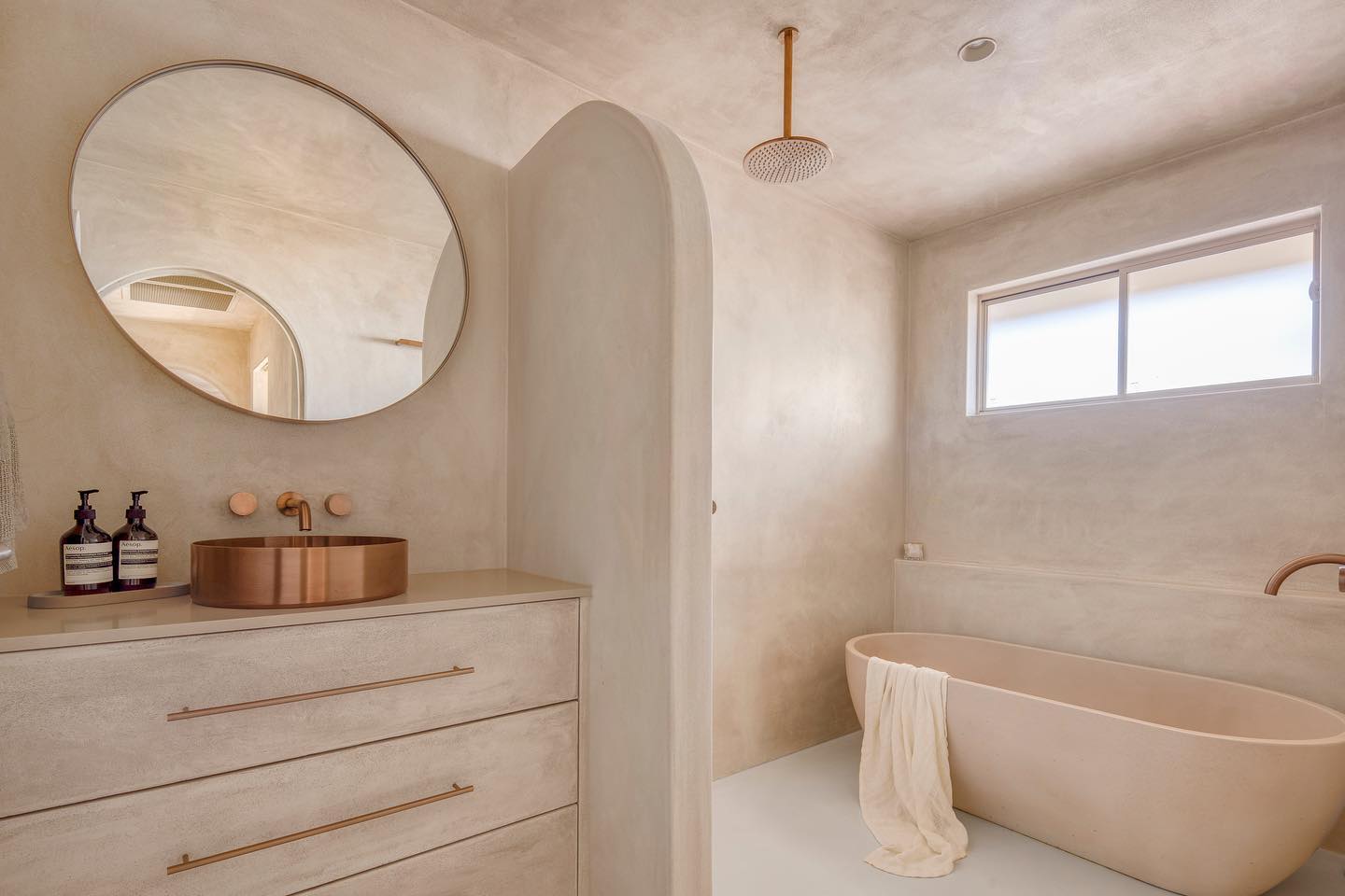 Using raw wall materials like micro cement you create a purely natural feeling bathroom space that is a match made in heaven with the copper tapware.