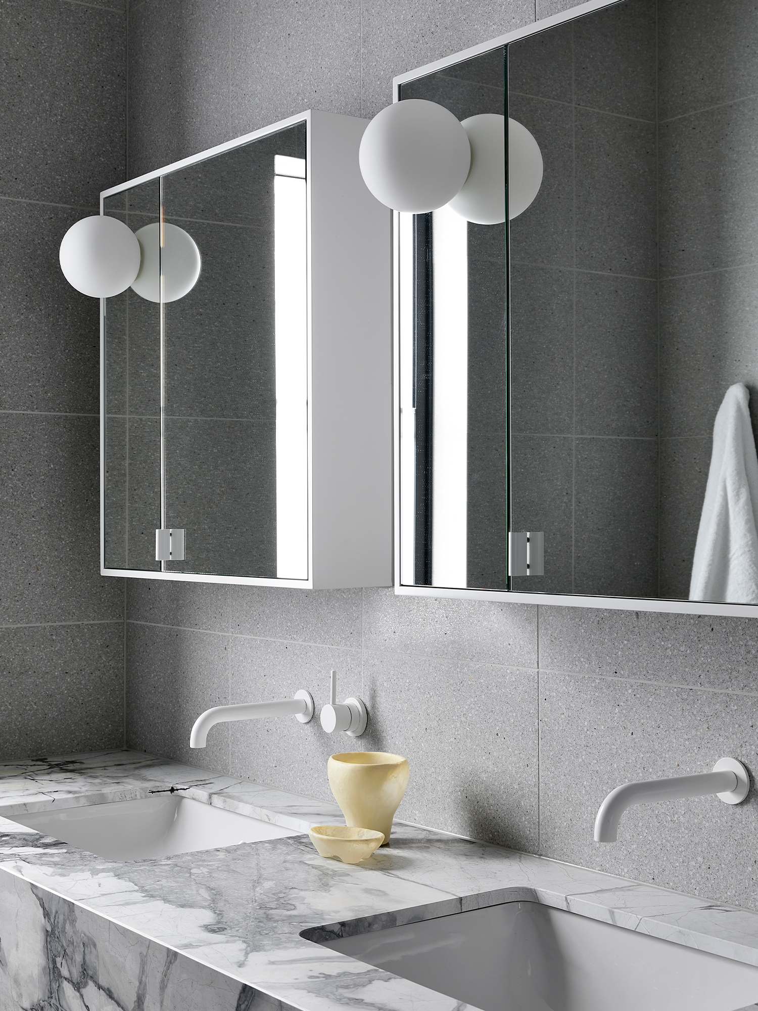 Matt white tapware will be big in 2024 and 2025 bathroom tapware trends due to the fact it is different but still goes with the grey terrazzo trends which is super popular.