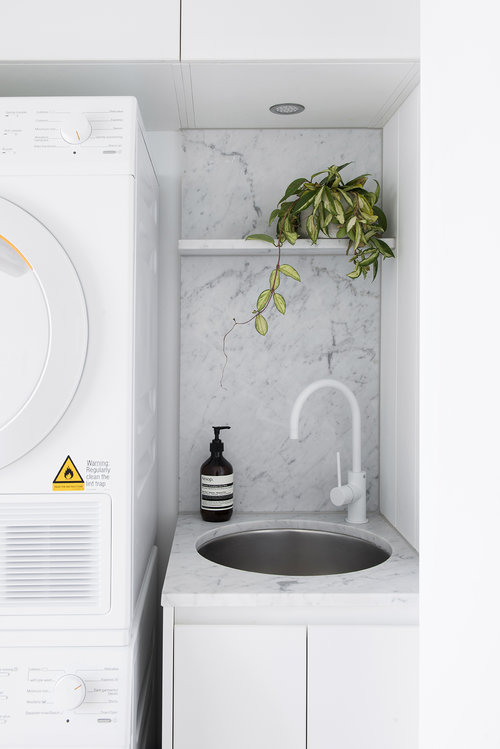 White tapware looks probably best either against a black background or a white finish. This white finish can be either a straight white or a marble white like the example below that really blend well and soften the space.