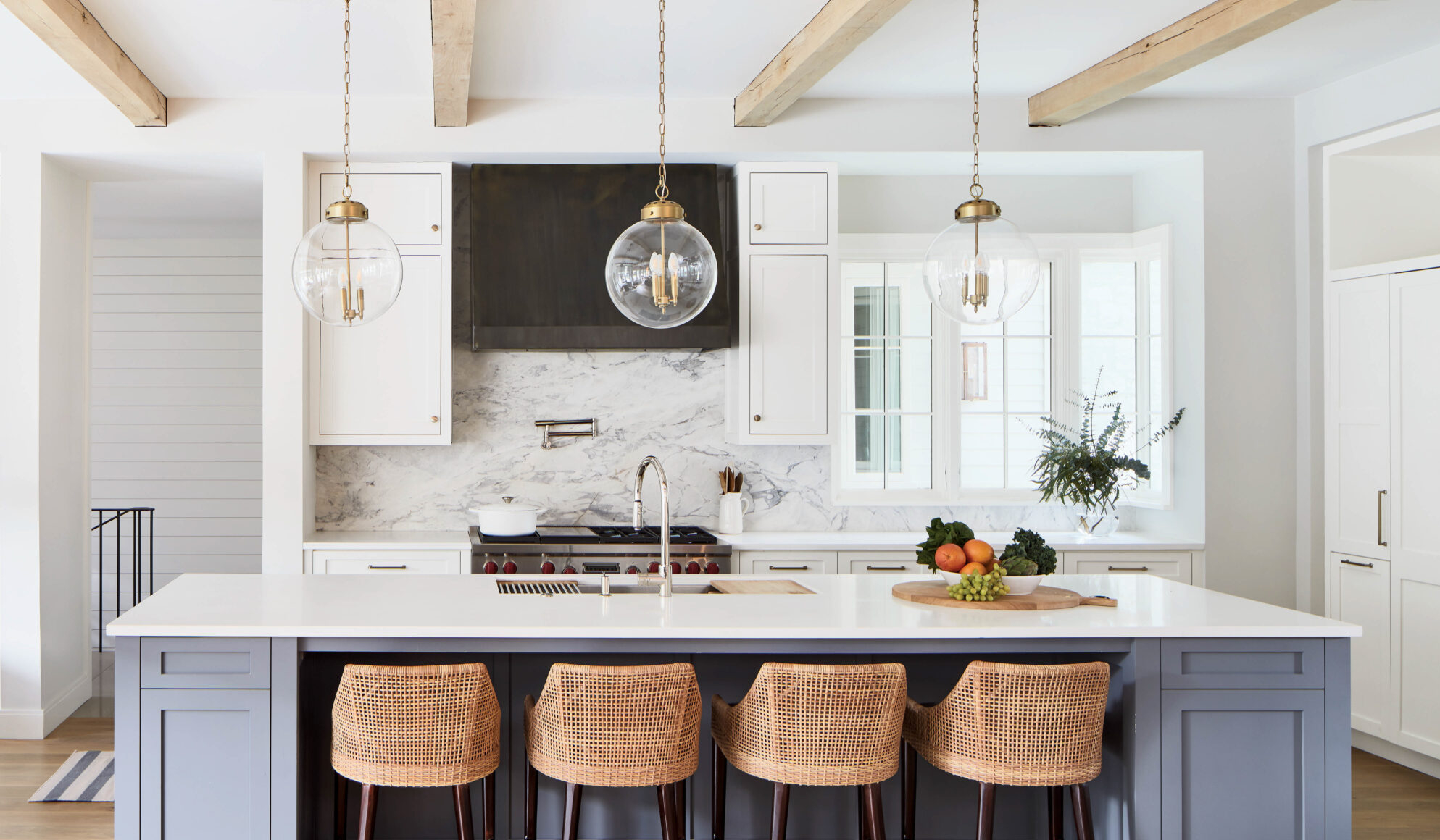 For a Hamptons-style kitchen choose statement metal, woven cane and ceramic pendant lights in a large format.