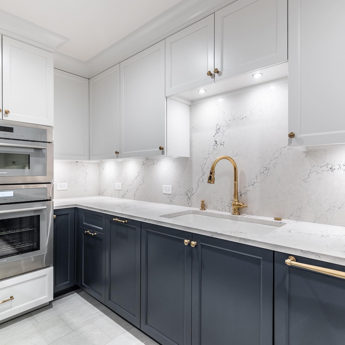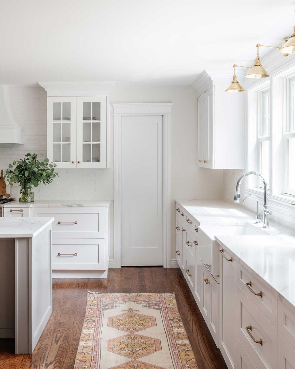 Think all white with a cabinet or few cabinets in that bold blue tone of your choice or baby blue below.