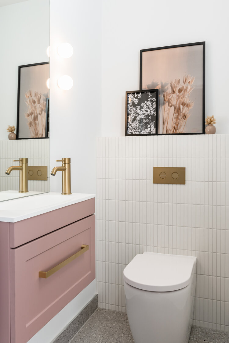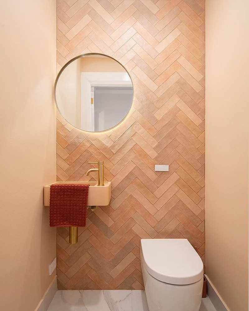 Starting with this beauty of a modern powder room using Kit Kat tiles, brushed brass tapware, and a touch of bold pink which is booming.